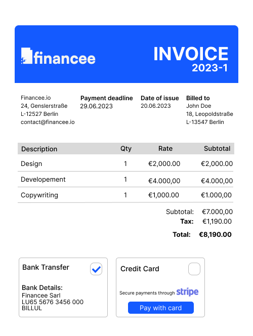 Financee accepts payments securely through Stripe, a leading payment gateway trusted by businesses worldwide. Stripe ensures the highest level of data security and protection for your payment transactions.